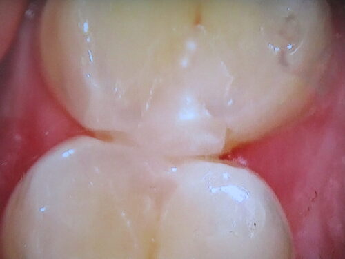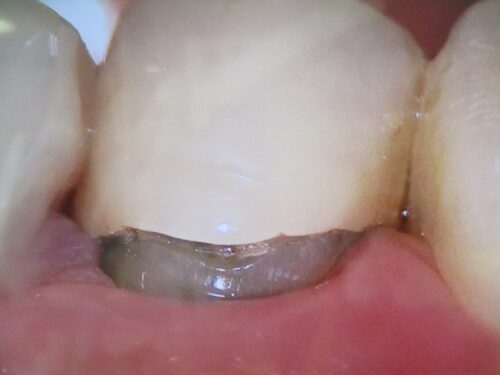 段差があり、汚れが付着しています。隣の歯をよく見て下さい。丸みがあったはずが、削られてしまい、平面になってしまっています。