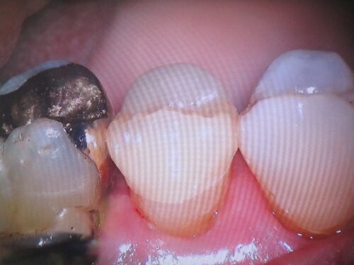 動画は、数年前に他院で治療を受けた、上の前歯を裏側から撮影させて頂きました。よく見かける不適合な(ピッタリしてない)セラミッククラウンです。患者さんは動画を見るまで全く気付かなかったそうですが、大きな隙間が空いており、汚れが溜まっています。このままでは内部の歯が虫歯となるるので、治療が必要です。